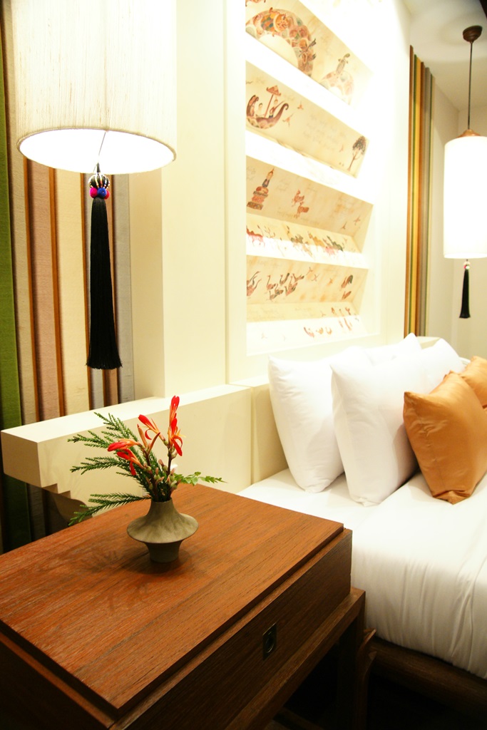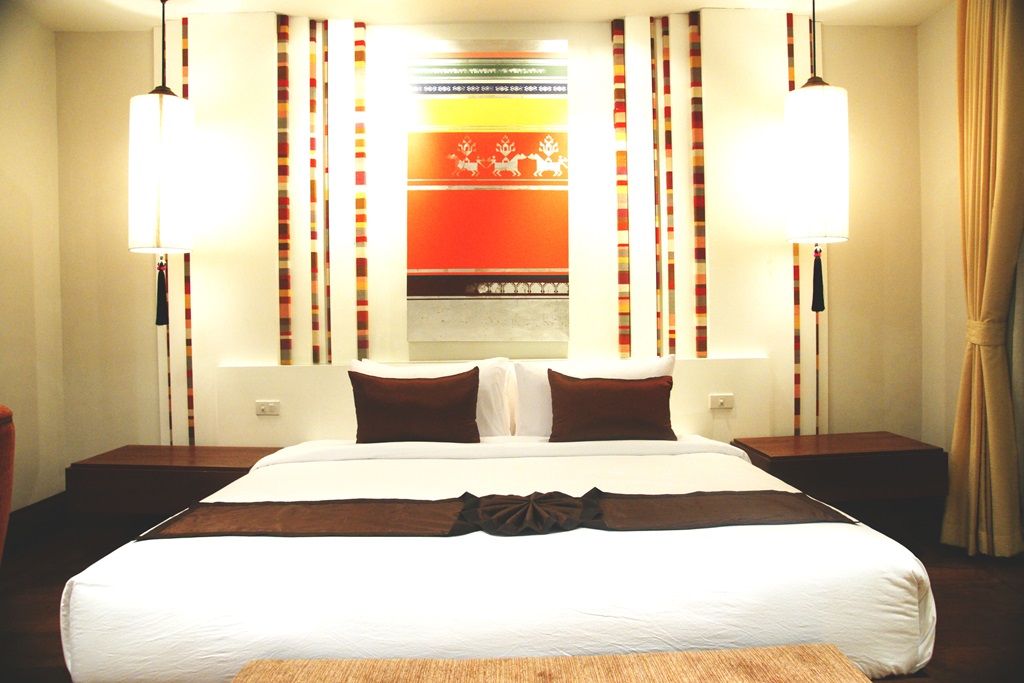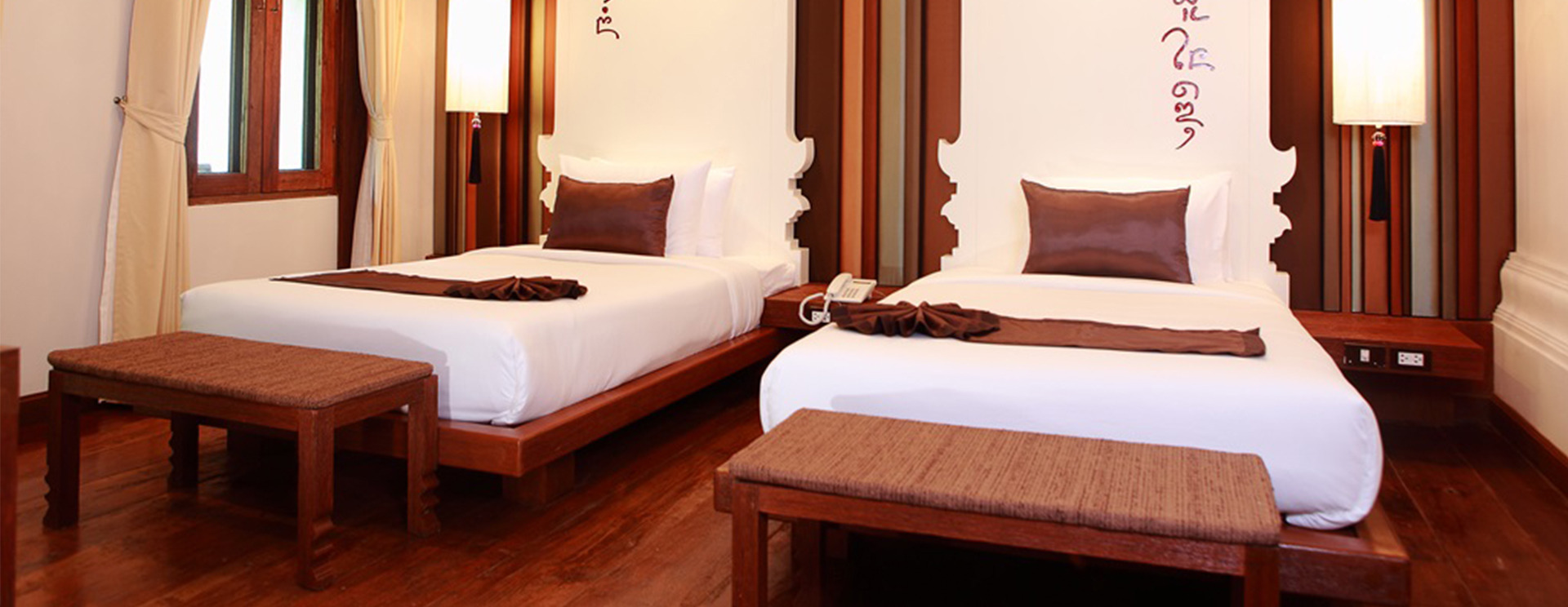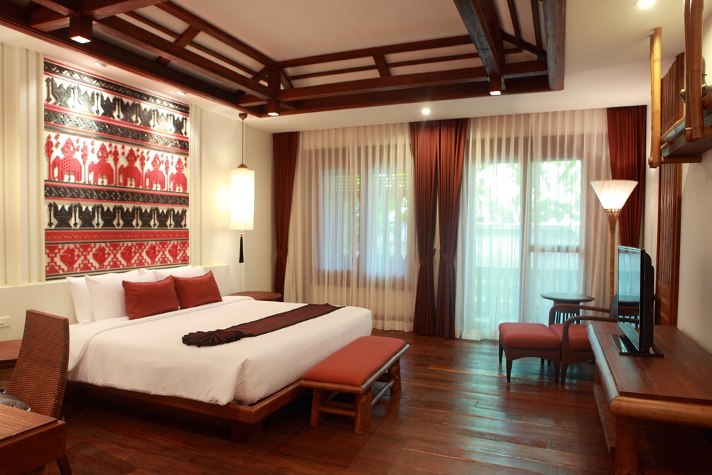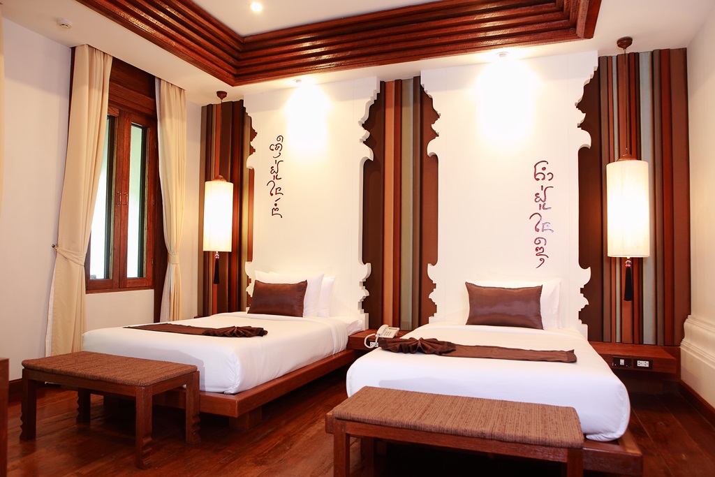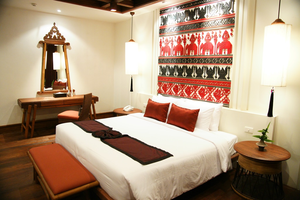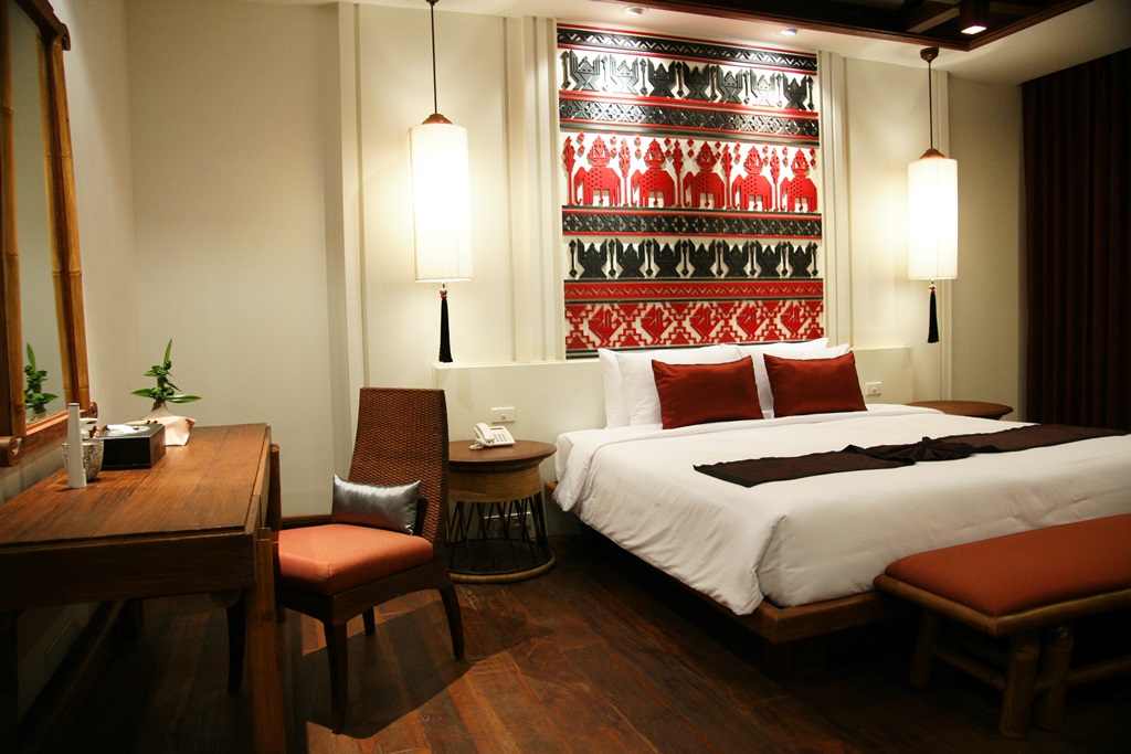 This stylish double or twin bed room is decorated in red and brown colors with overhead weaving craftworks and warm lighting to represent fascinating traditional ‘Tai Lue’ style, the northern Thai culture.