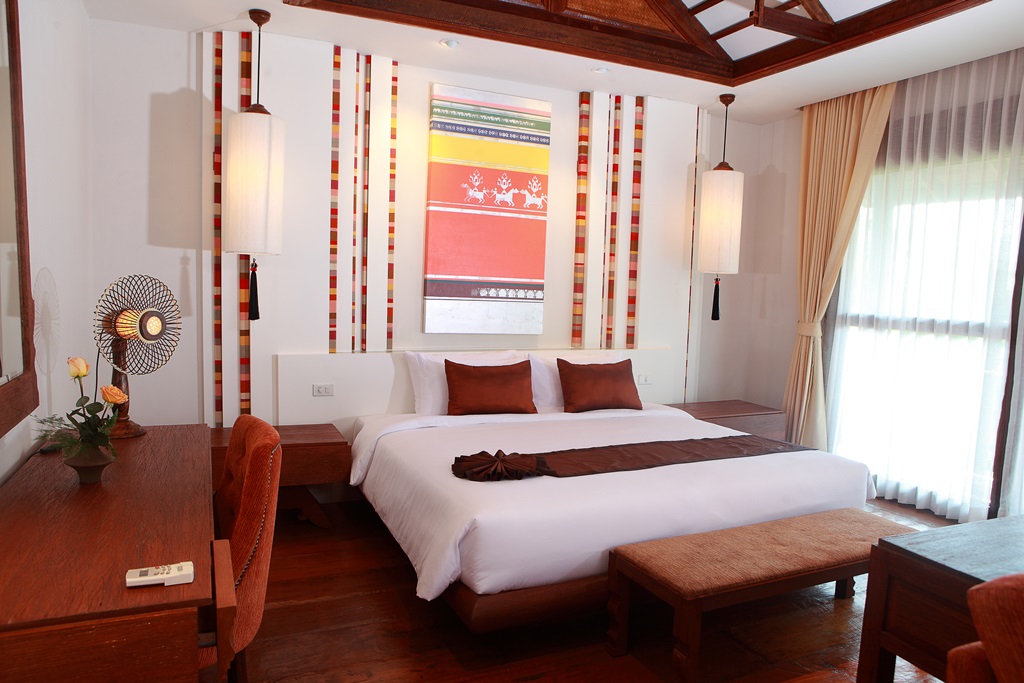 This stylish double or twin bed room is decorated in red and brown colors with overhead weaving craftworks and warm lighting to represent fascinating traditional ‘Tai Lue’ style, the northern Thai culture.